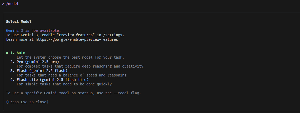 首先我们输入/model就可以切换模,这时候我们看到我们的模型是没有Gemini 3的,是因为我们没有开启使用。